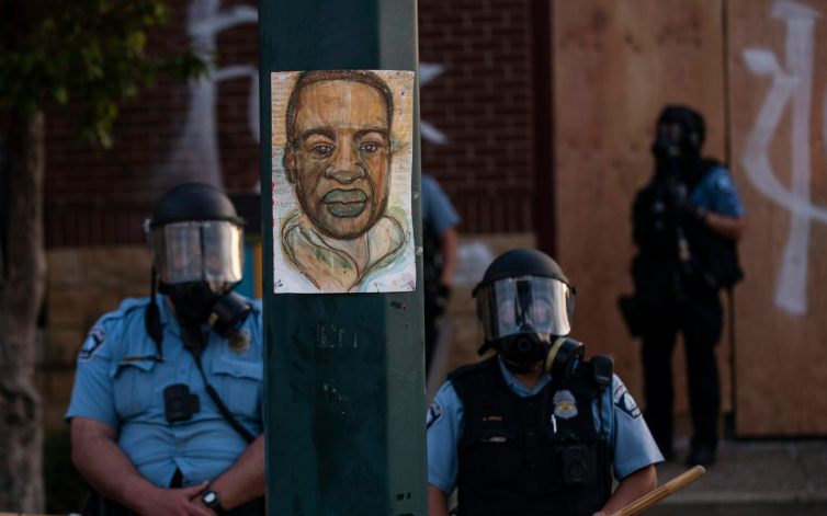 A portrait of George Floyd hangs on a street light pole as police officers stand guard at the Third Police Precinct during a face off with a group of protesters on May 27, 2020 in Minneapolis. Stephen Maturen/Getty Images