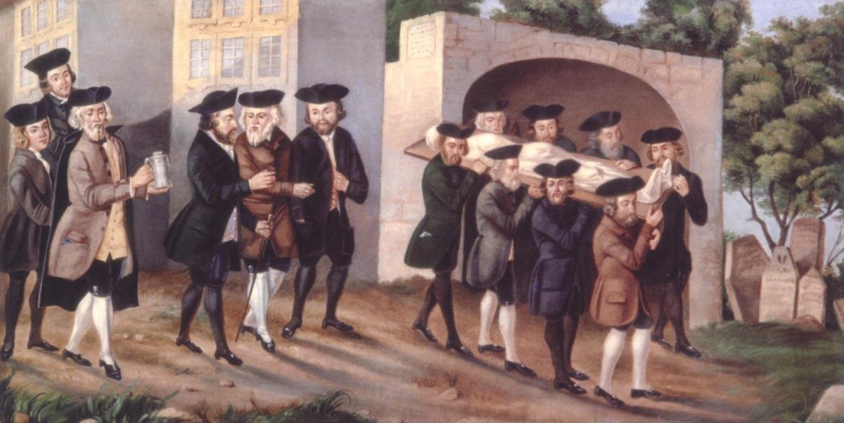 “Body to the Grave.” One of fifteen paintings depicting the burial process by The Prague Burial Society (c. 1772)