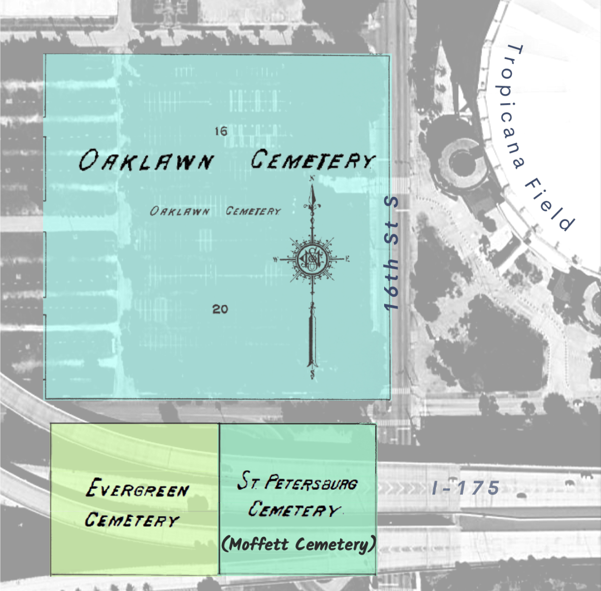 Map depicting the locations of Oaklawn, Evergreen & Moffett Cemetery using a 1923 map overlay
